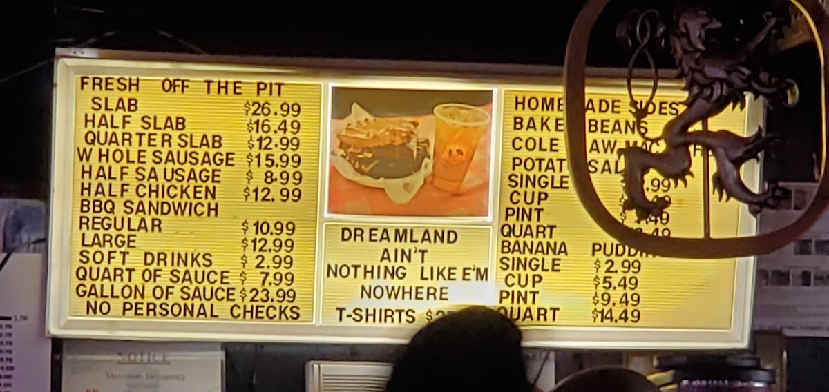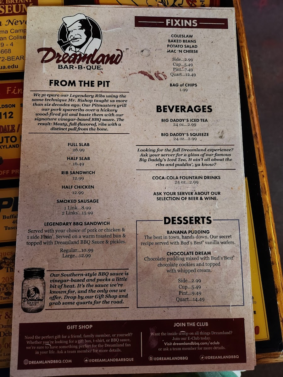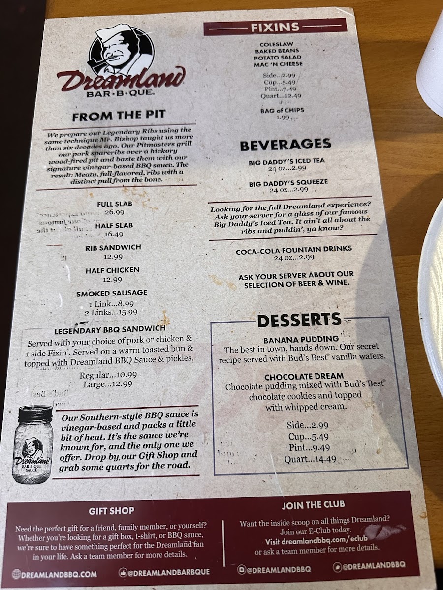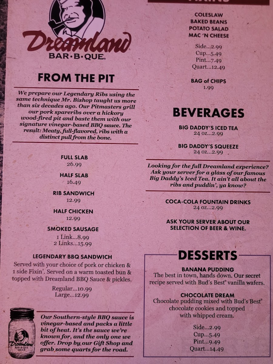 Served with your choice of pork or chicken & 1 side Fixin’. Served on a warm toasted bun & topped with Dreamland BBQ Sauce & Pickles.